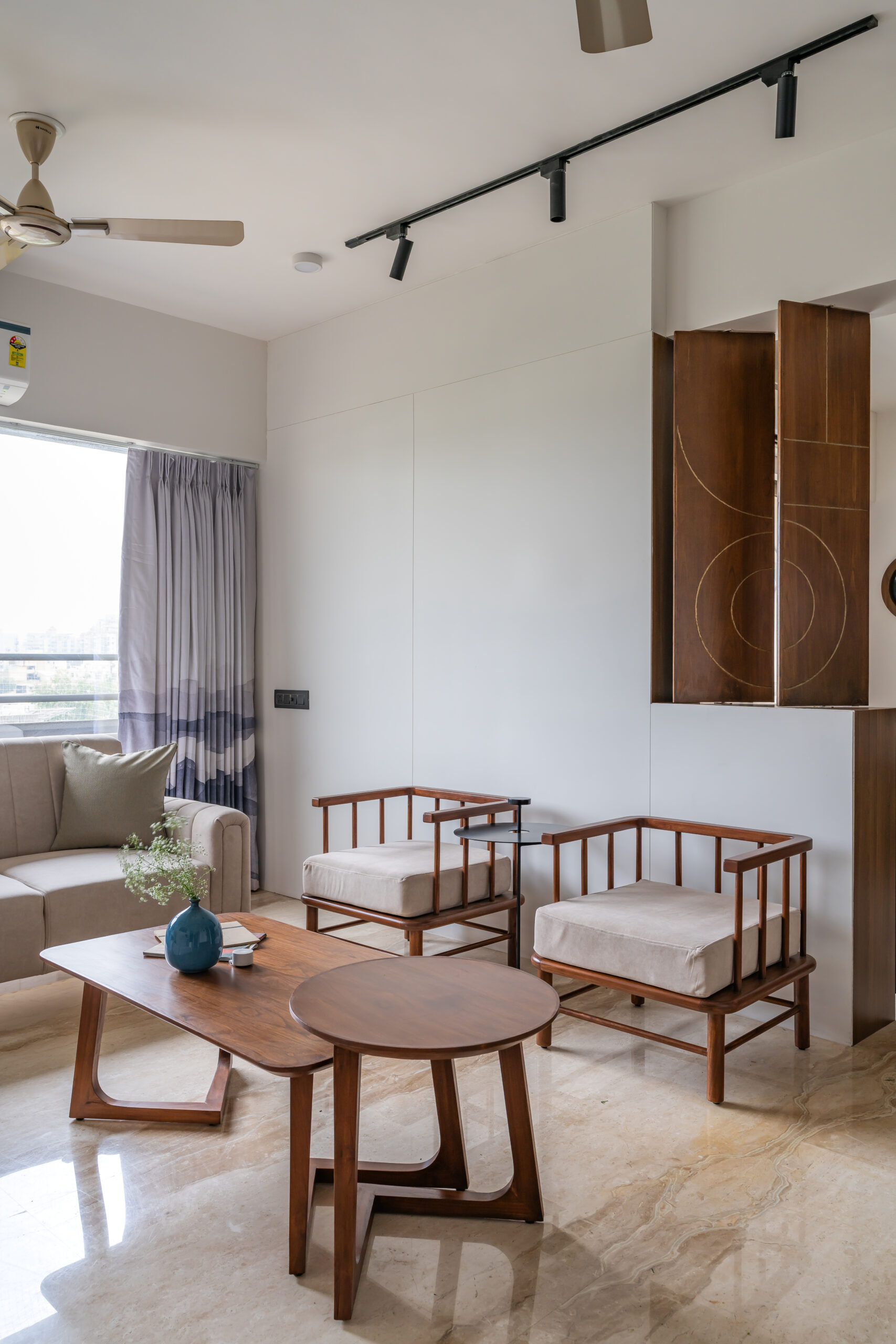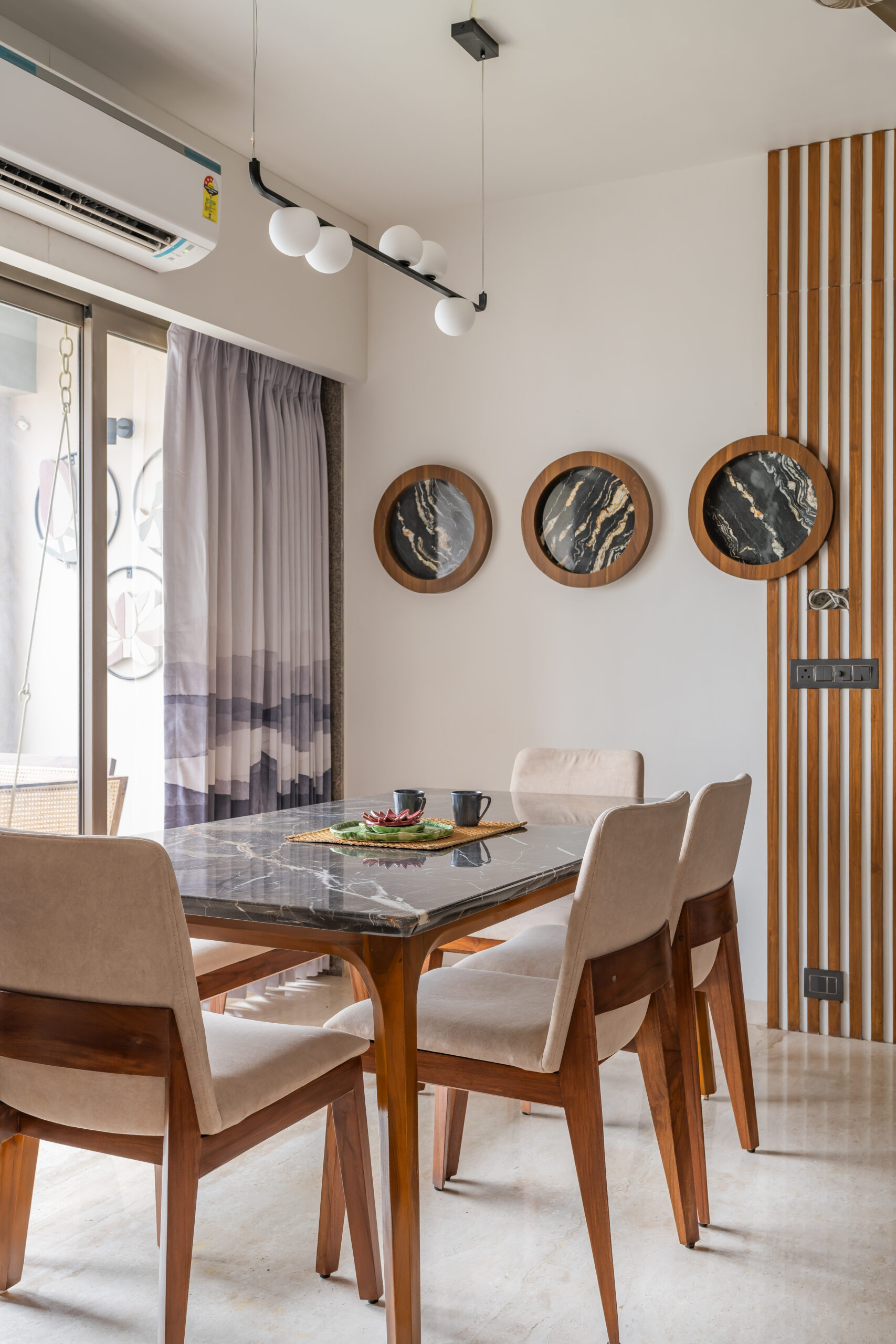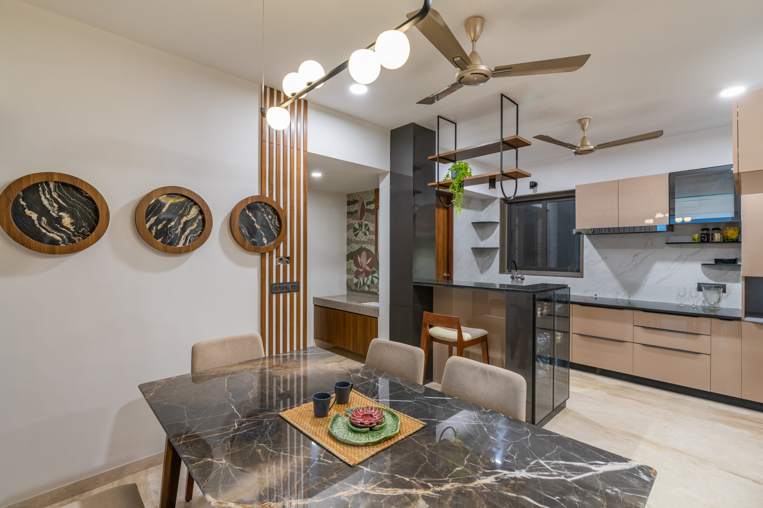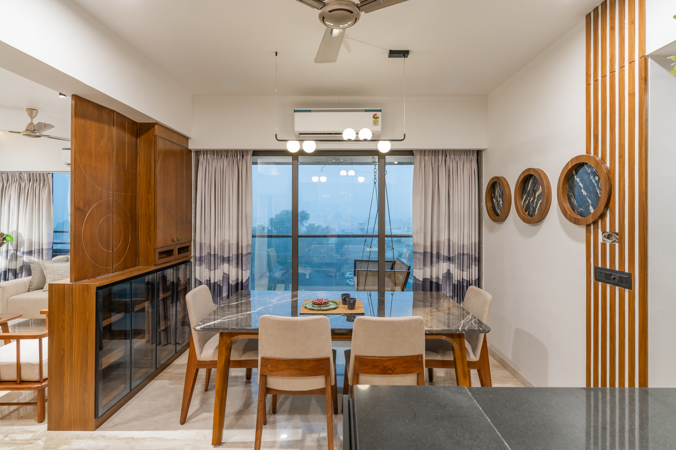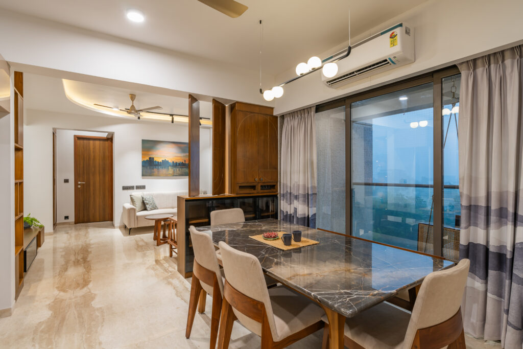 This interior showcases a modern contemporary architectural style with warm wooden finishes and neutral tones. The space features walnut-toned wooden furniture, a marble-top dining table, beige upholstered chairs, and cane-accent seating, creating a balanced and elegant look.