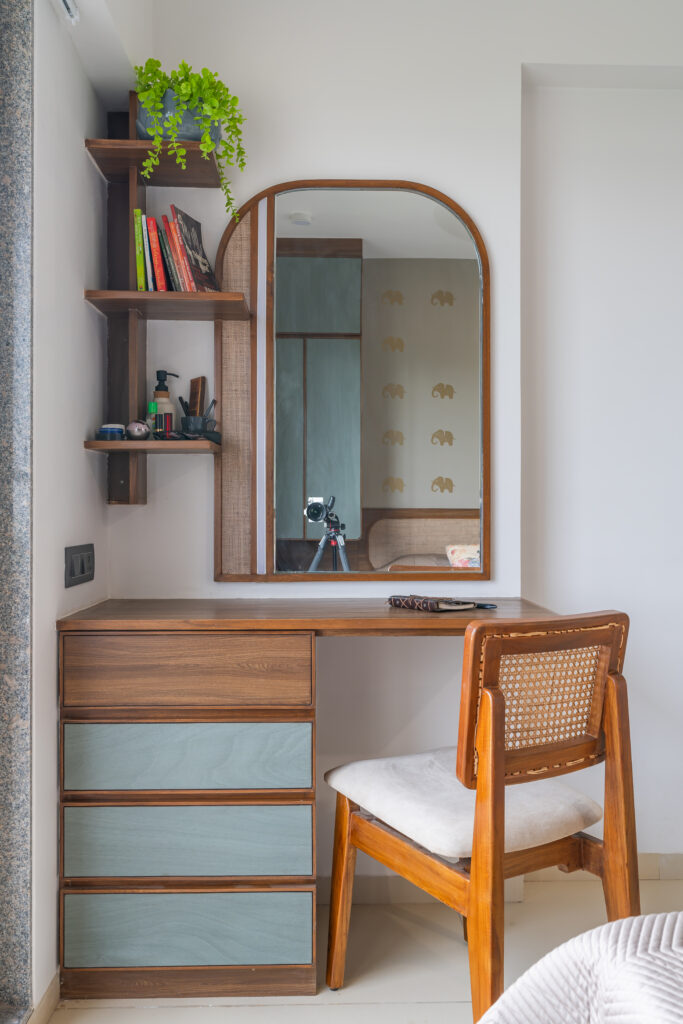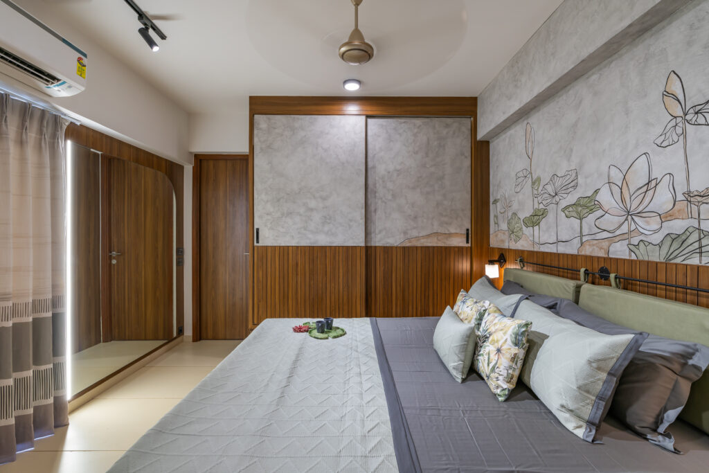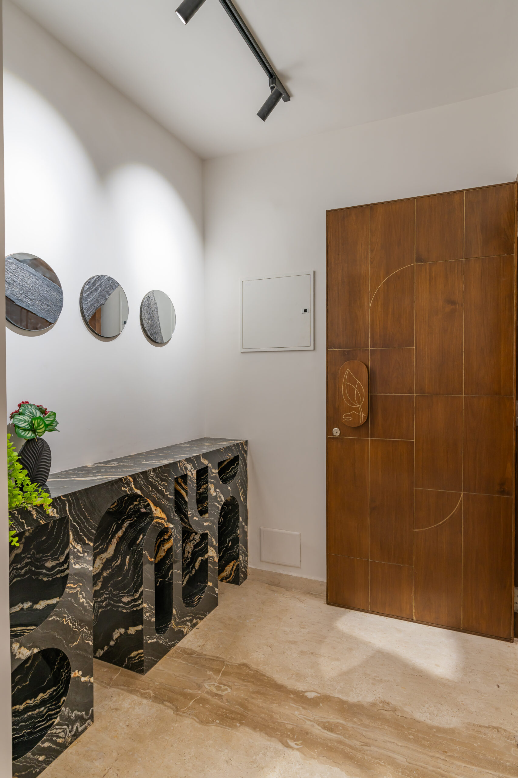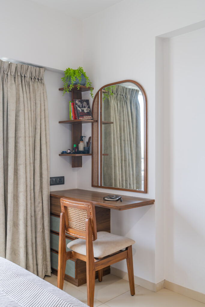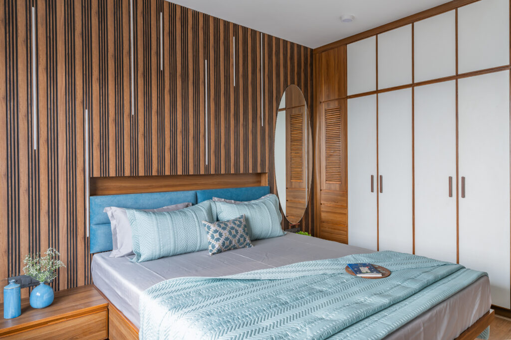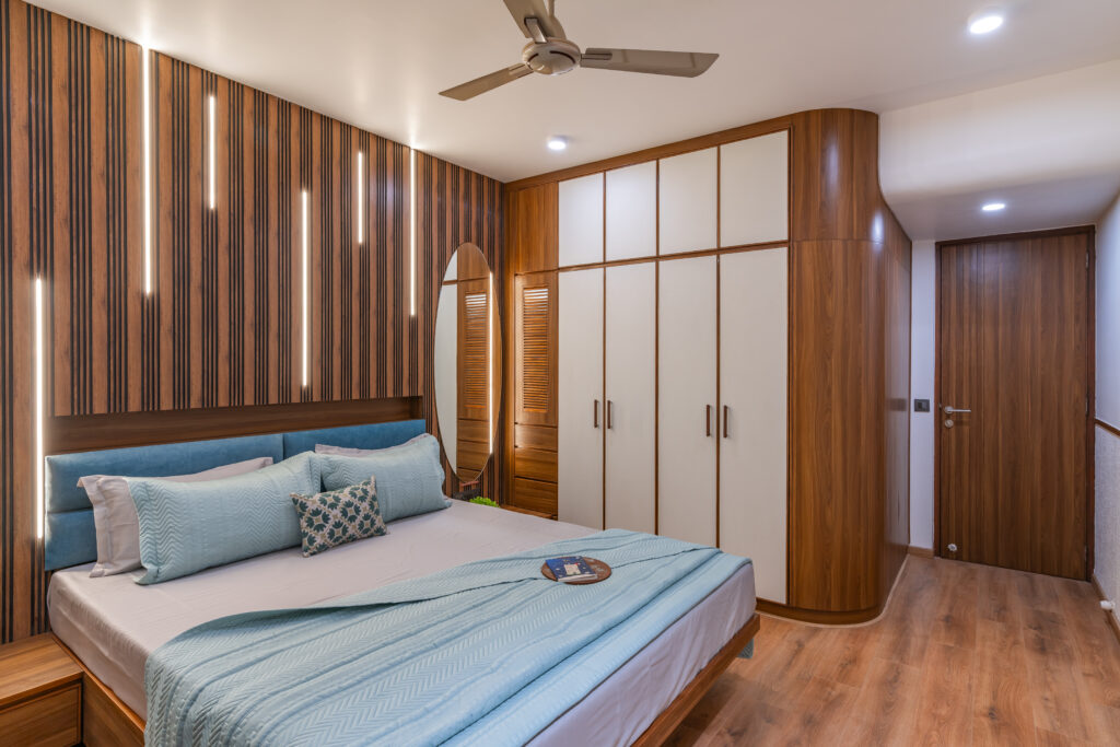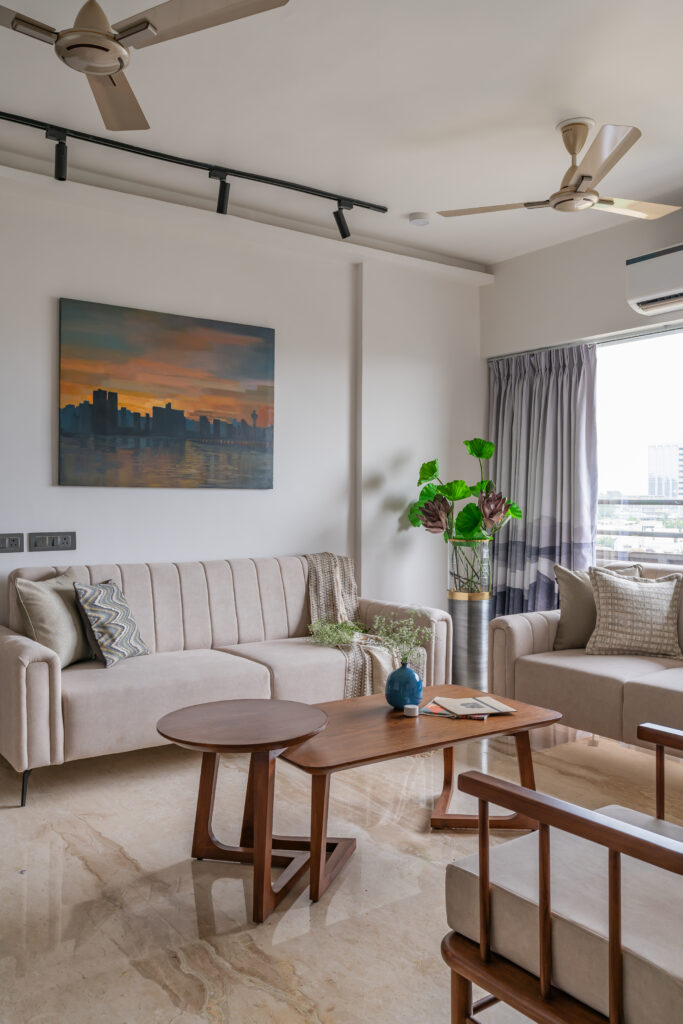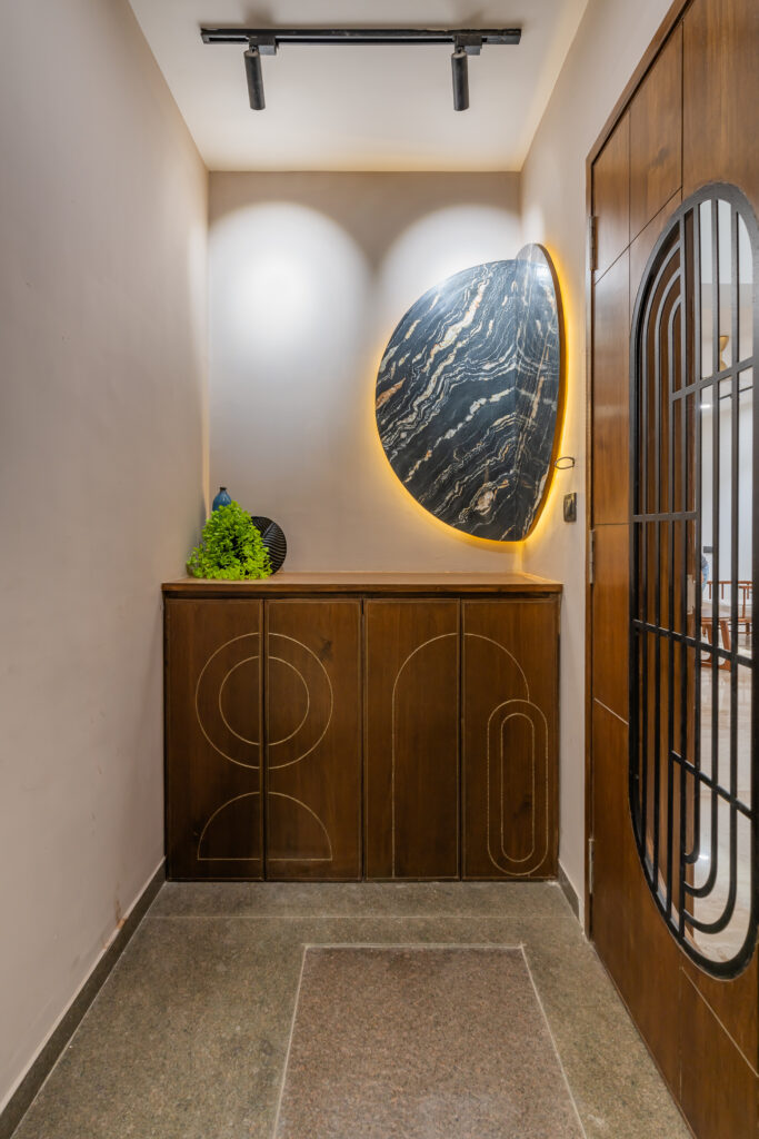 This interior showcases a modern contemporary architectural style with warm wooden finishes and neutral tones. The space features walnut-toned wooden furniture, a marble-top dining table, beige upholstered chairs, and cane-accent seating, creating a balanced and elegant look.