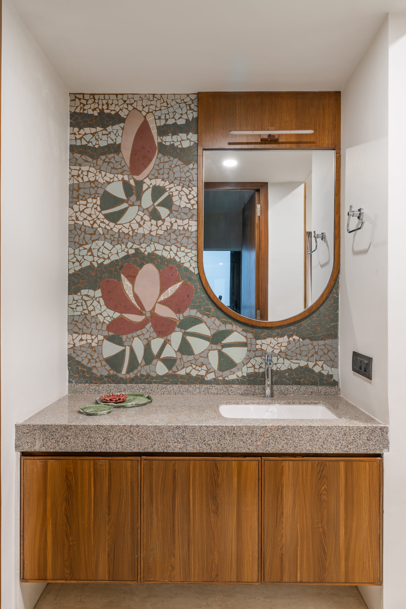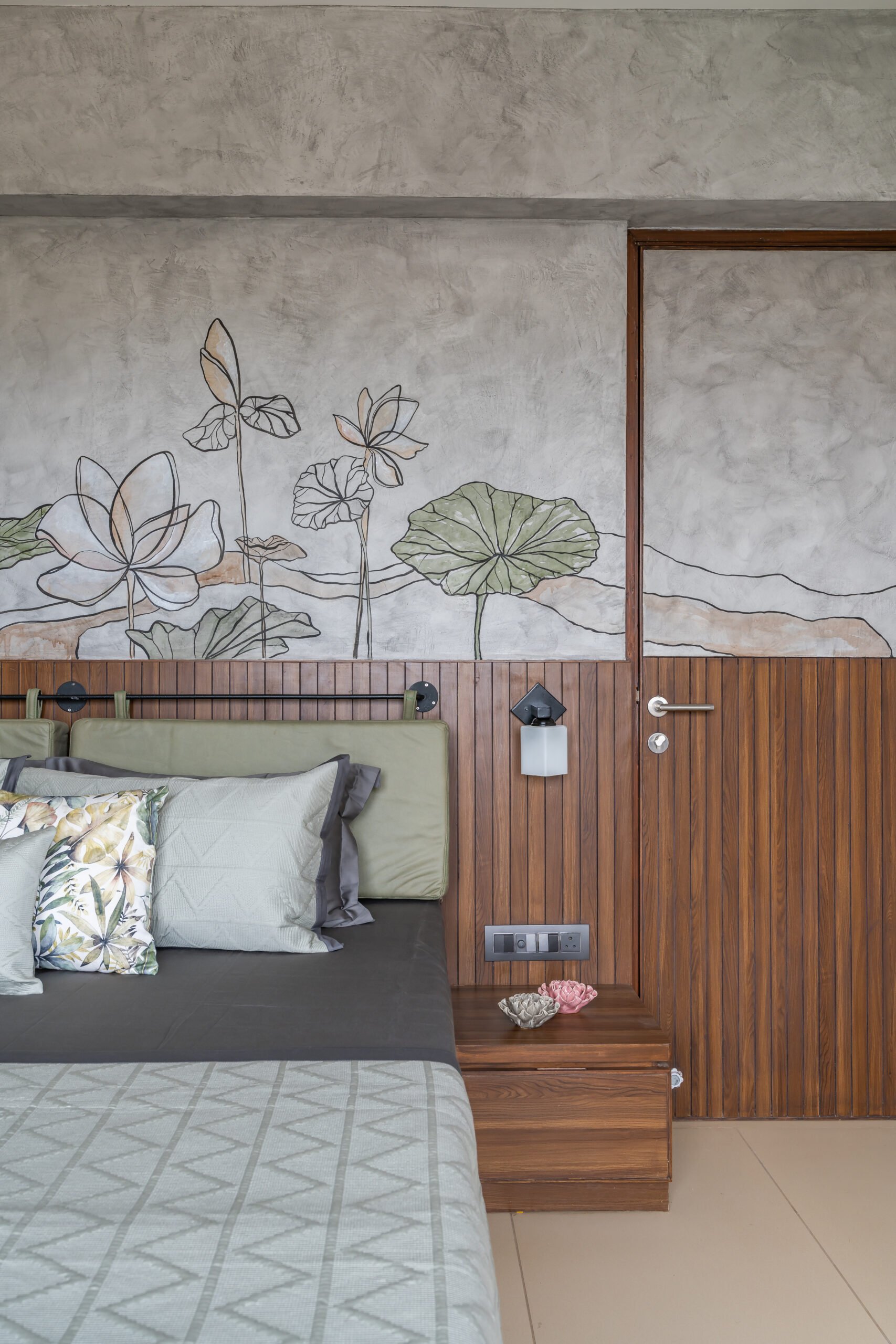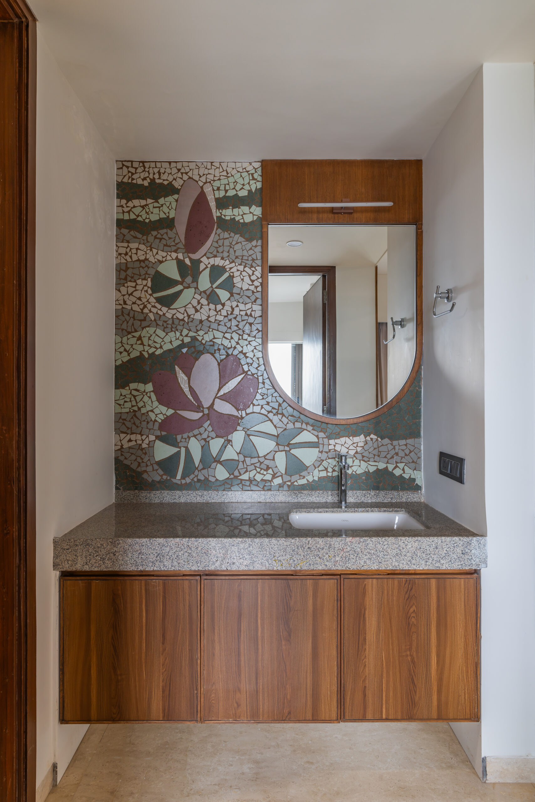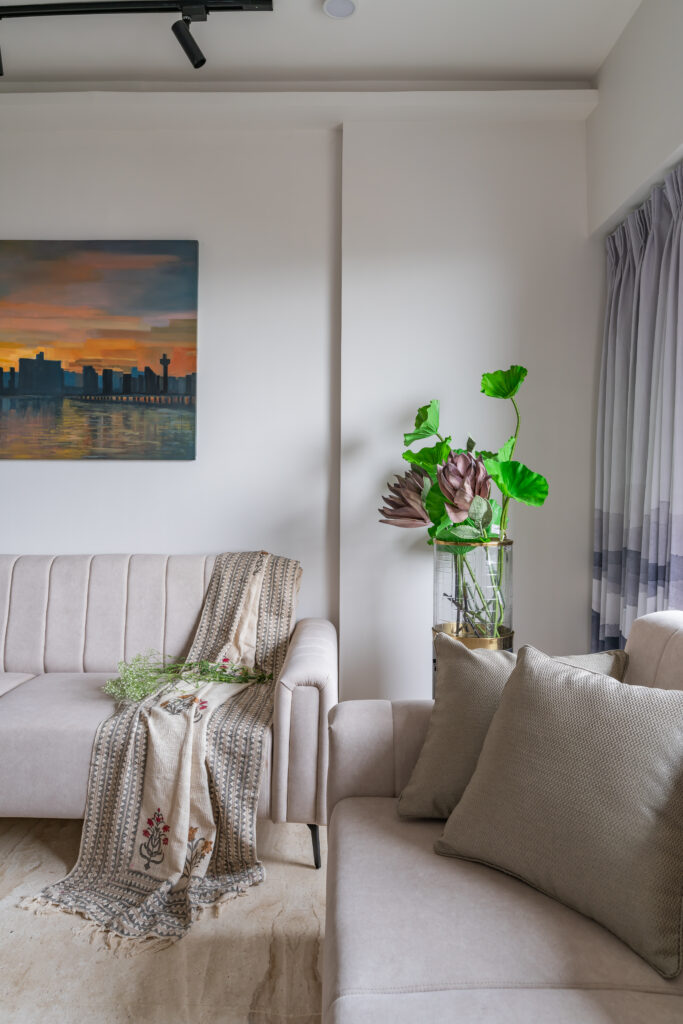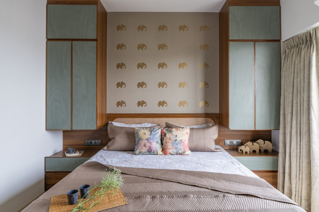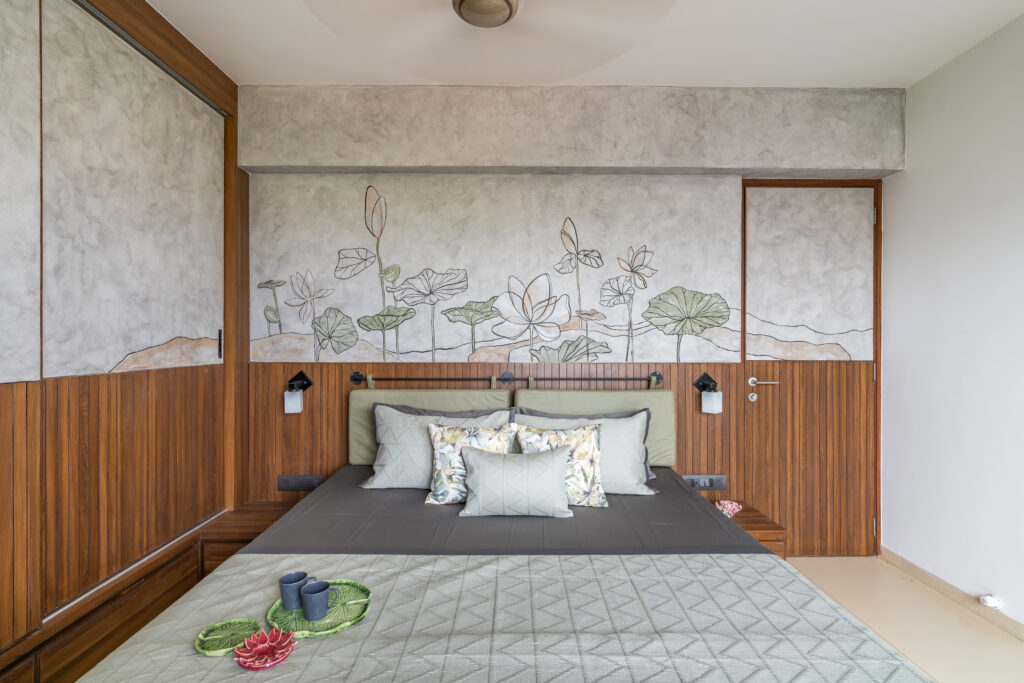 This interior showcases a modern contemporary architectural style with warm wooden finishes and neutral tones. The space features walnut-toned wooden furniture, a marble-top dining table, beige upholstered chairs, and cane-accent seating, creating a balanced and elegant look.