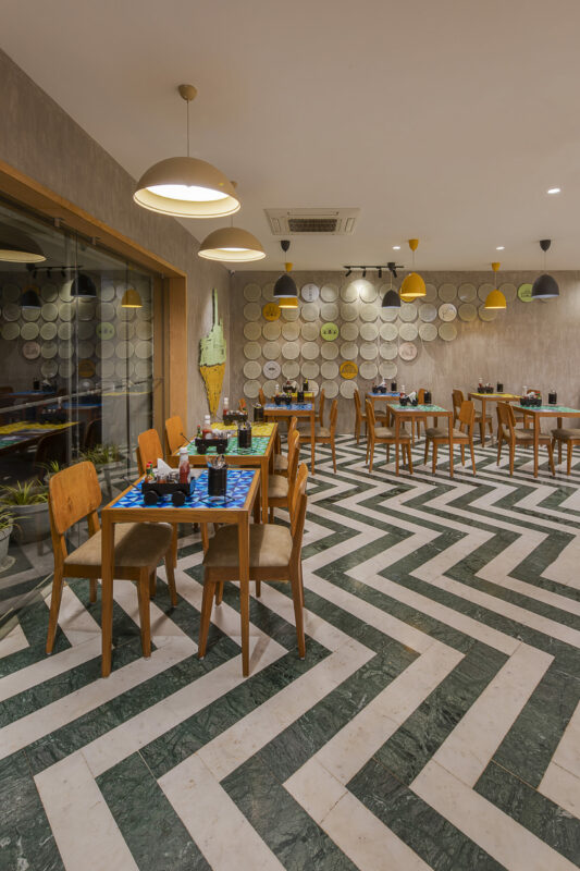 Table tops with Ceramic material have been our usual go to to create a customized edge for hospitality projects. Specially Cafes where fast moving crowds have to be served with impeccable service every hour. A relaxed cafe experience along with an enjoyable colourful surface with easy maintenance is a must for a modern cafe.